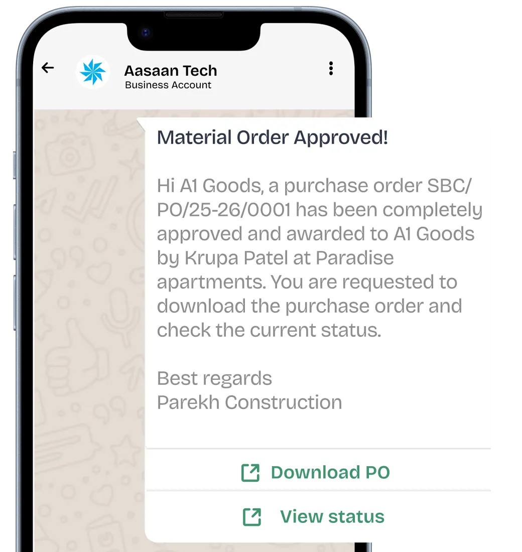 Your Meta-verified WhatsApp becomes the universal project inbox. Aasaan's Super AI pushes reports and alerts straight to you with actionable buttons, keeping communication flowing and project momentum high.