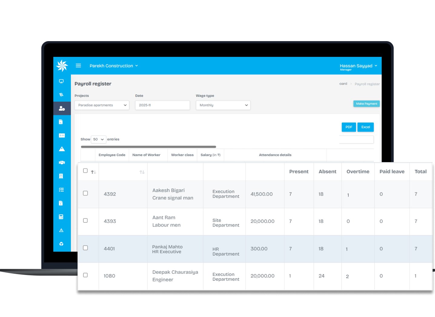 Yes. It manages error-free, end-to-end payroll and wage management. The system handles site-specific rules, taxes, and deductions automatically.